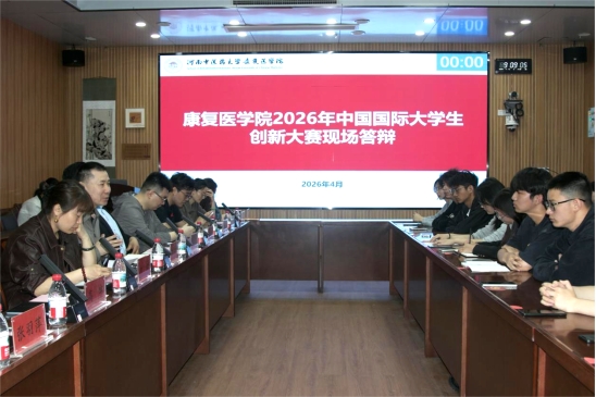 本网讯(文/万秋平 李芮 图/桑婧芸)为深化创新创业教育改革,激发学生创新精神与实践能力,助力学生成长成才,康复医学院于4月15日上午9:00在教学楼8楼BM800会议室成功举办2026年中国国际大学生创新大赛院内选拔赛。本次答辩由万秋平主持,康复医学院副院长许国防、刘斌,郑州市童馨园养老服务有限公司常务副总经理汤璇,河南中医药大学就业创业指导科科长刘超,教师代表郑婕、吴楠,学工办全体老师及19支入围答辩的参赛团队参与本次活动。