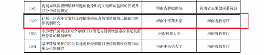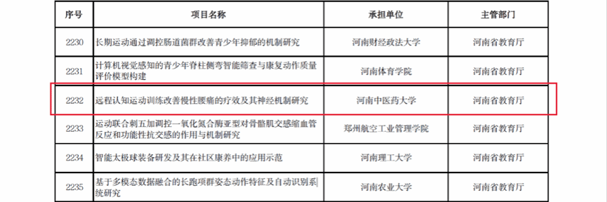 本网讯(文/王孟雨 图/王孟雨)根据《河南省科技计划项目管理办法(试行)》和《河南省科技计划项目信息公开管理办法》要求,经过学校推荐、专家评审、公示等环节,河南省科学技术厅研究确定了2026年度河南省科技攻关立项项目,我院康复物理治疗教研室武莉华老师撰写的“针刺干预青年首发轻度抑郁障碍患者负性情绪加工的脑电时频机制研究”以及常田田老师撰写的“远程认知运动训练改善慢性腰痛的疗效及其神经机制研究”获得立项。