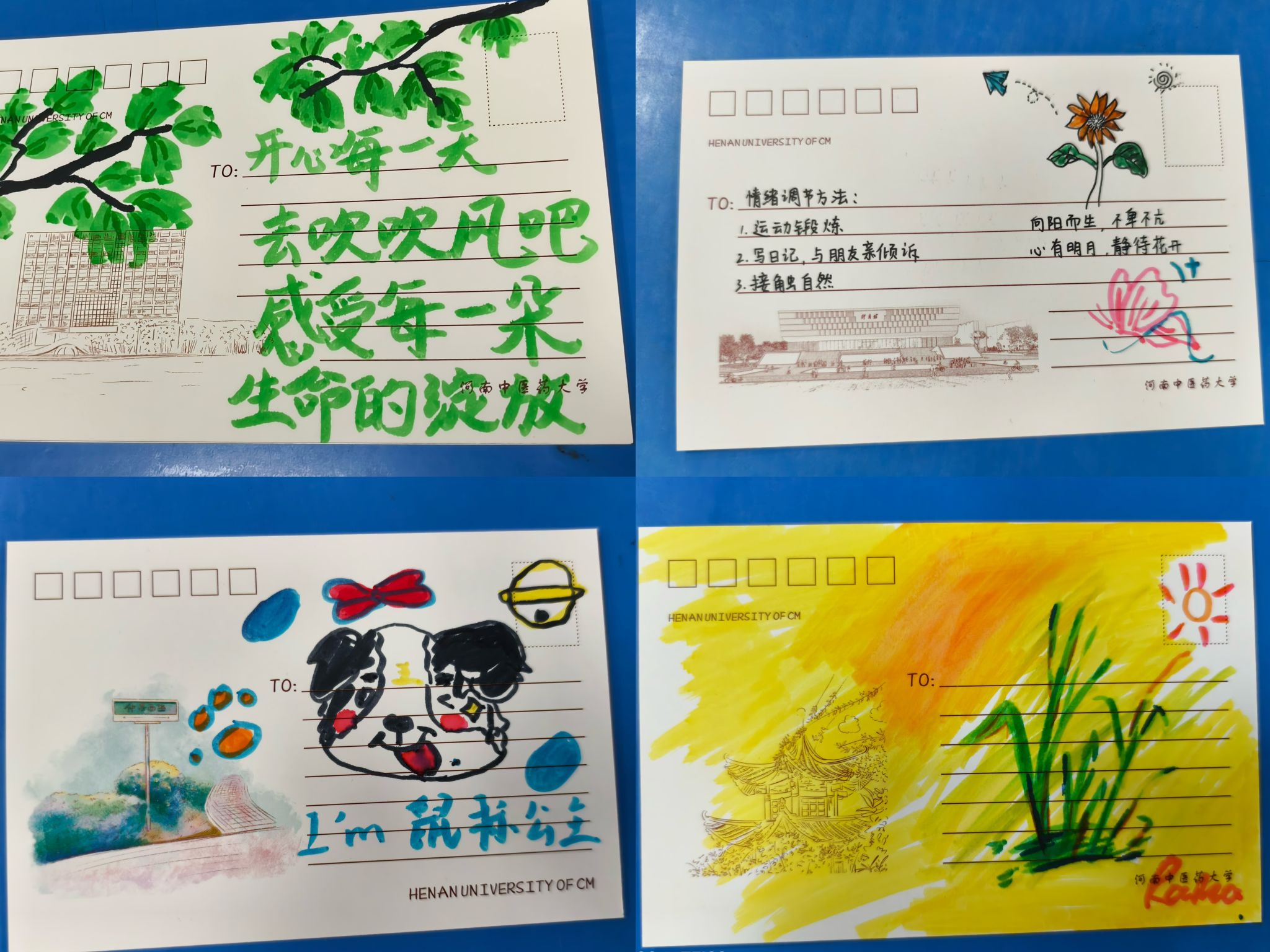 核心环节中,通过“书写+绘画+交换”的沉浸式体验,同学们动手制作“心药”明信片,发现自身闪光点,筑牢做事底气与信心,让土行的孕育与承载之意具象化,将无形的心理疏导转化为可触摸的 “心灵良方”。本次团辅活动以土行特质为纽带,“书写”是自我沉淀的“扎根”过程,“绘画”是情绪孕育的“滋养”环节,“交换” 则是心灵连接的“过渡”桥梁。随机交换明信片的过程,打破了个体的心理局限,如同土行作为五行枢纽般,让同学们在分享中传递鼓励与祝福,感受集体带来的稳定感,这份相互的支持也让每一颗心灵更有底气。