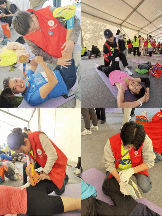 这片设在终点附近的拉伸服务区,人头攒动却秩序井然。25名来自康复医学院的研究生志愿者,运用动态拉伸、静态保持等专业手法,为疲惫的跑者们进行系统性放松。团队成员首先快速评估跑者的参赛项目,随后量身定制拉伸方案。对于常见的股四头肌僵硬、腓肠肌痉挛以及下背部紧张等问题,同学们手法精准,力道适中,一边操作一边耐心讲解拉伸要点与后续恢复注意事项。一位刚接受完服务的全马选手感慨道:“跑到最后双腿像灌了铅,经过同学们的专业处理,肌肉的紧绷和酸胀感得到了极大缓解,这服务太及时、太贴心了!” 团队负责人张羽萍老师表示,参与此类大型赛事保障,是将课堂理论应用于实践的宝贵机会,也让公众直观感受到了康复医学在竞技体育与大众健身中的核心价值。