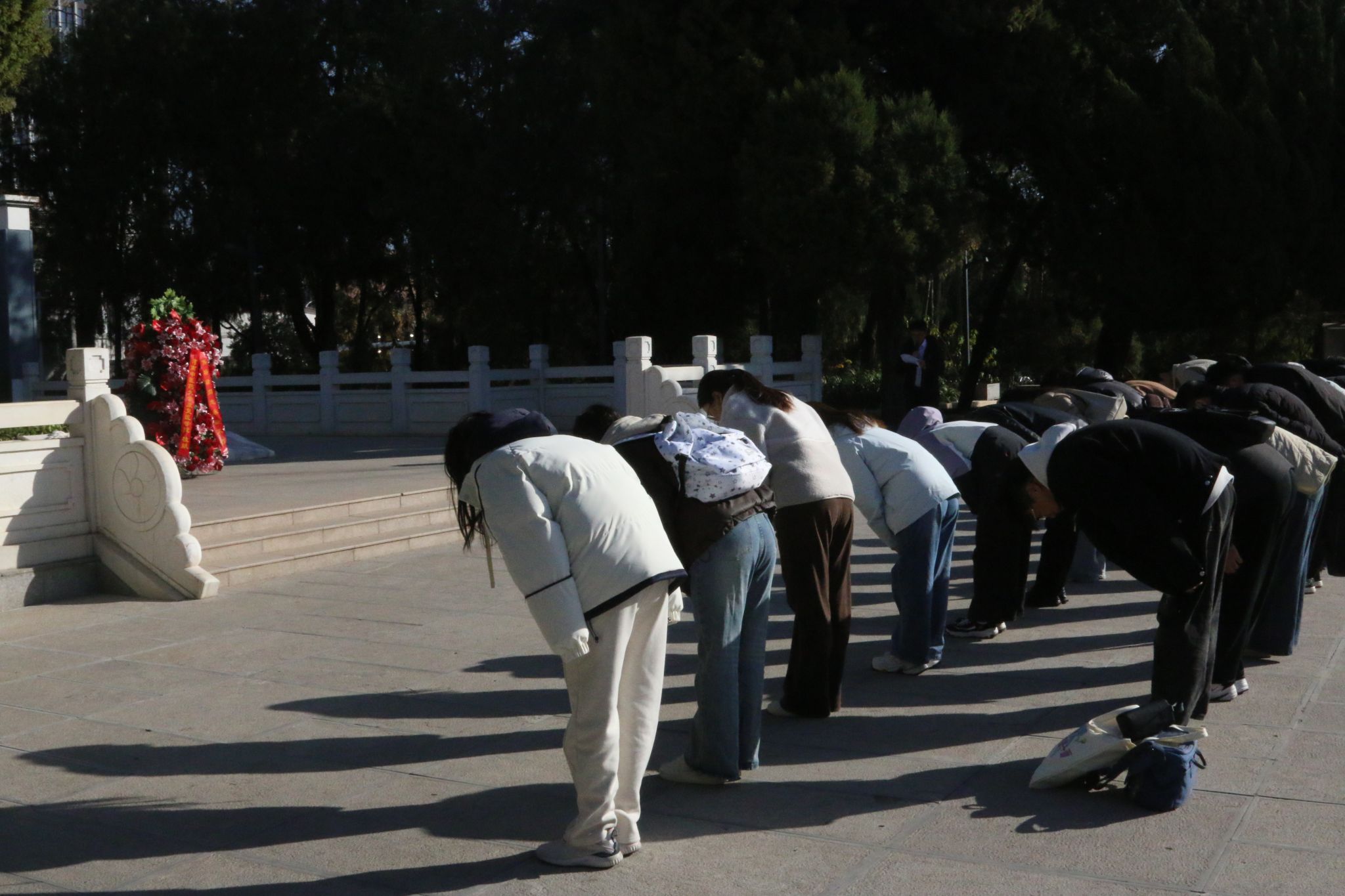 在焦裕禄烈士陵园,河南中医药大学康复医学院副院长许国防代表康复医学院一行人向焦裕禄陵墓敬献花篮,全体人员静默哀思,向焦裕禄烈士墓三鞠躬,瞻仰了焦裕禄烈士墓,深切缅怀人民的好公仆、干部的好榜样——焦裕禄同志。